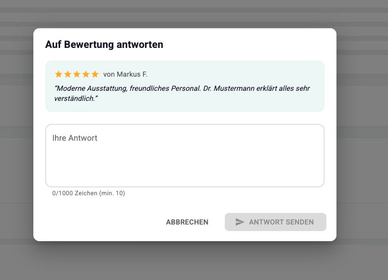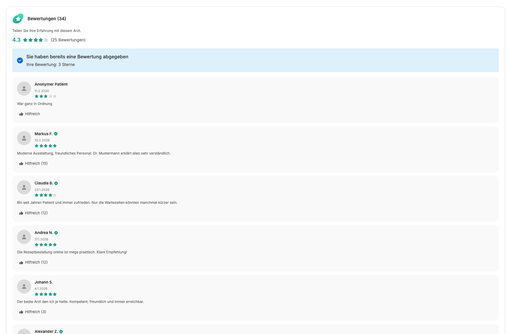 Patientenbewertungen direkt auf Ihrem Praxis- und Arztprofil. Statistiken, professionelle Antworten und DSGVO-konformer Datenschutz.