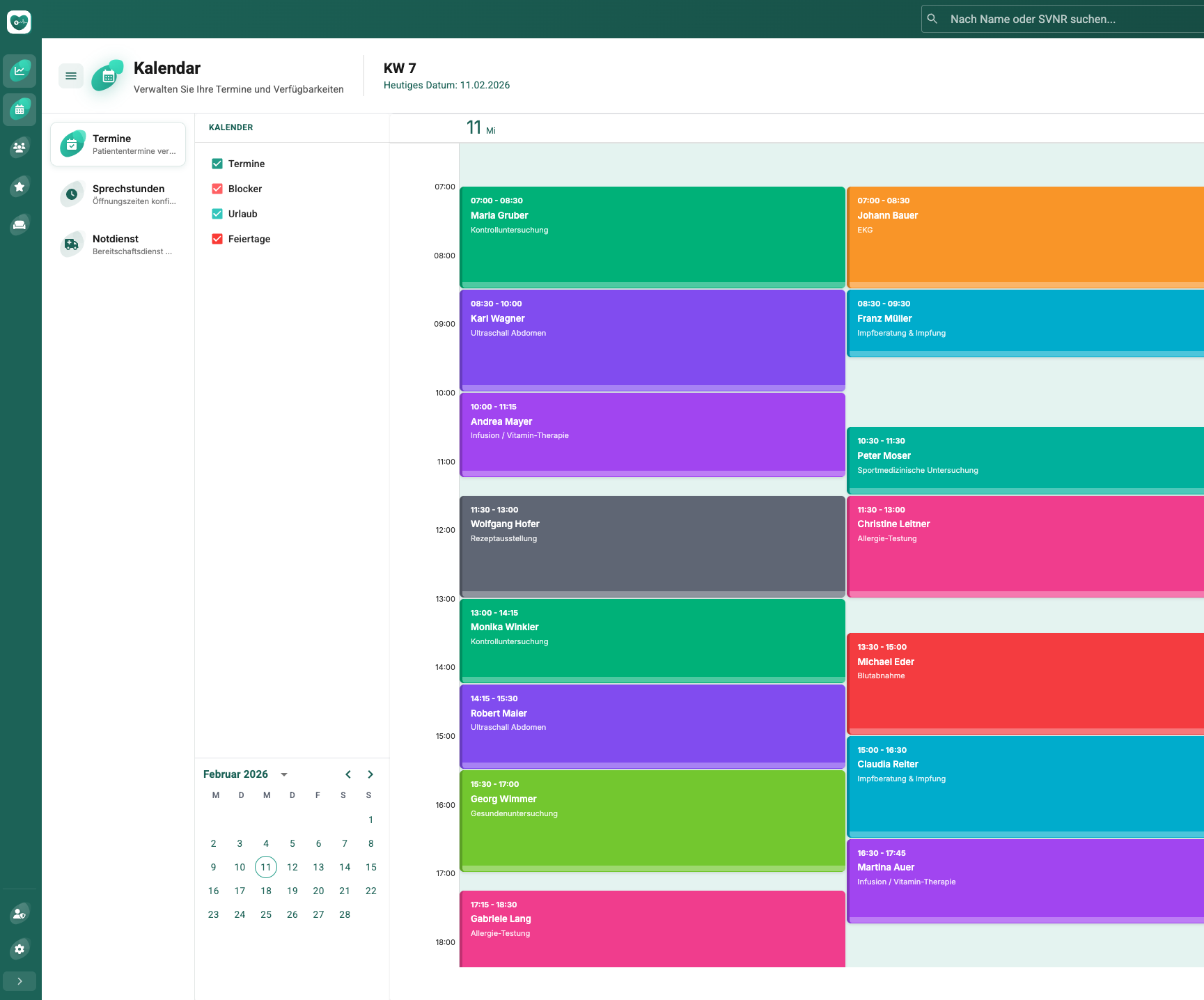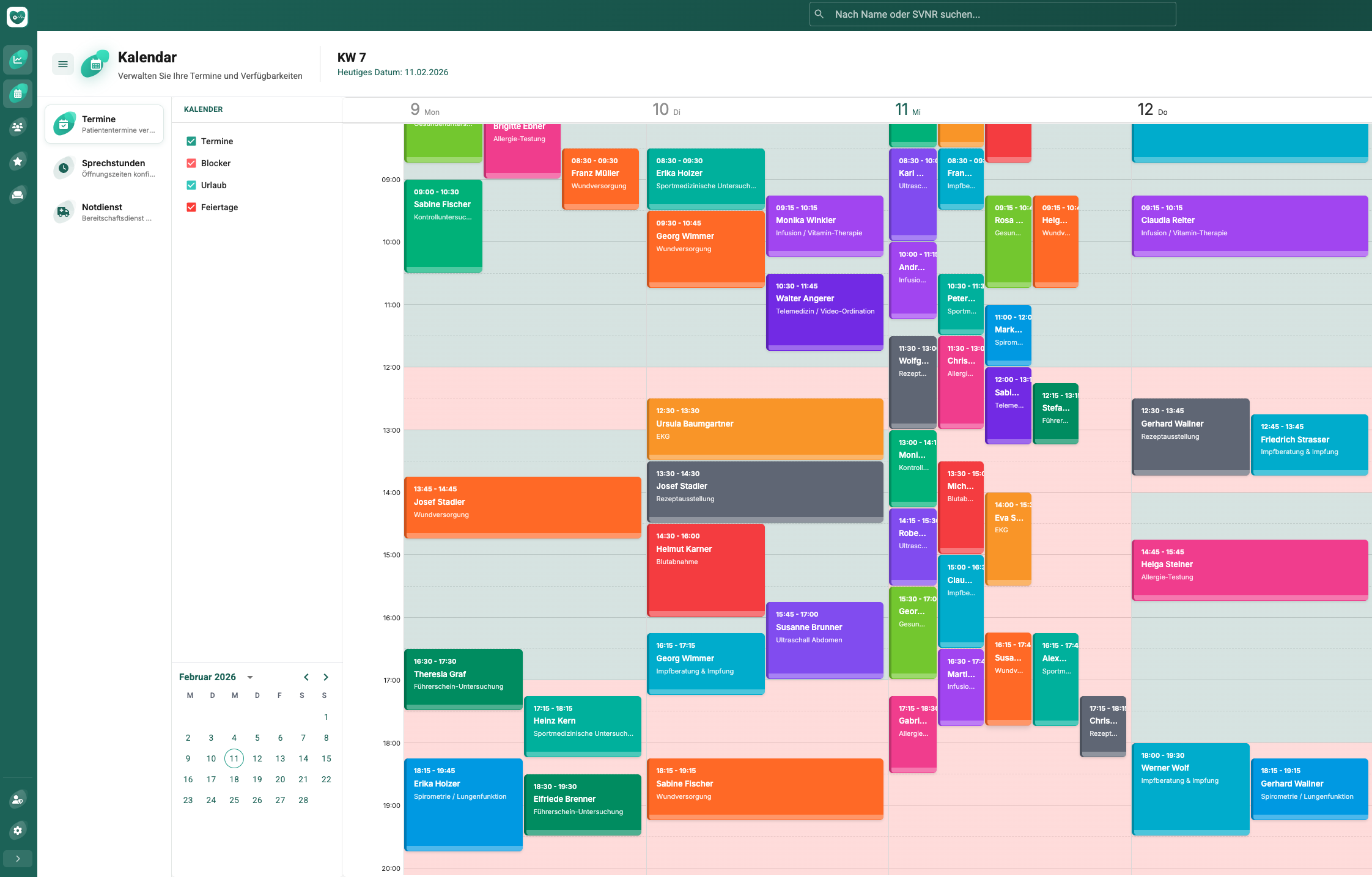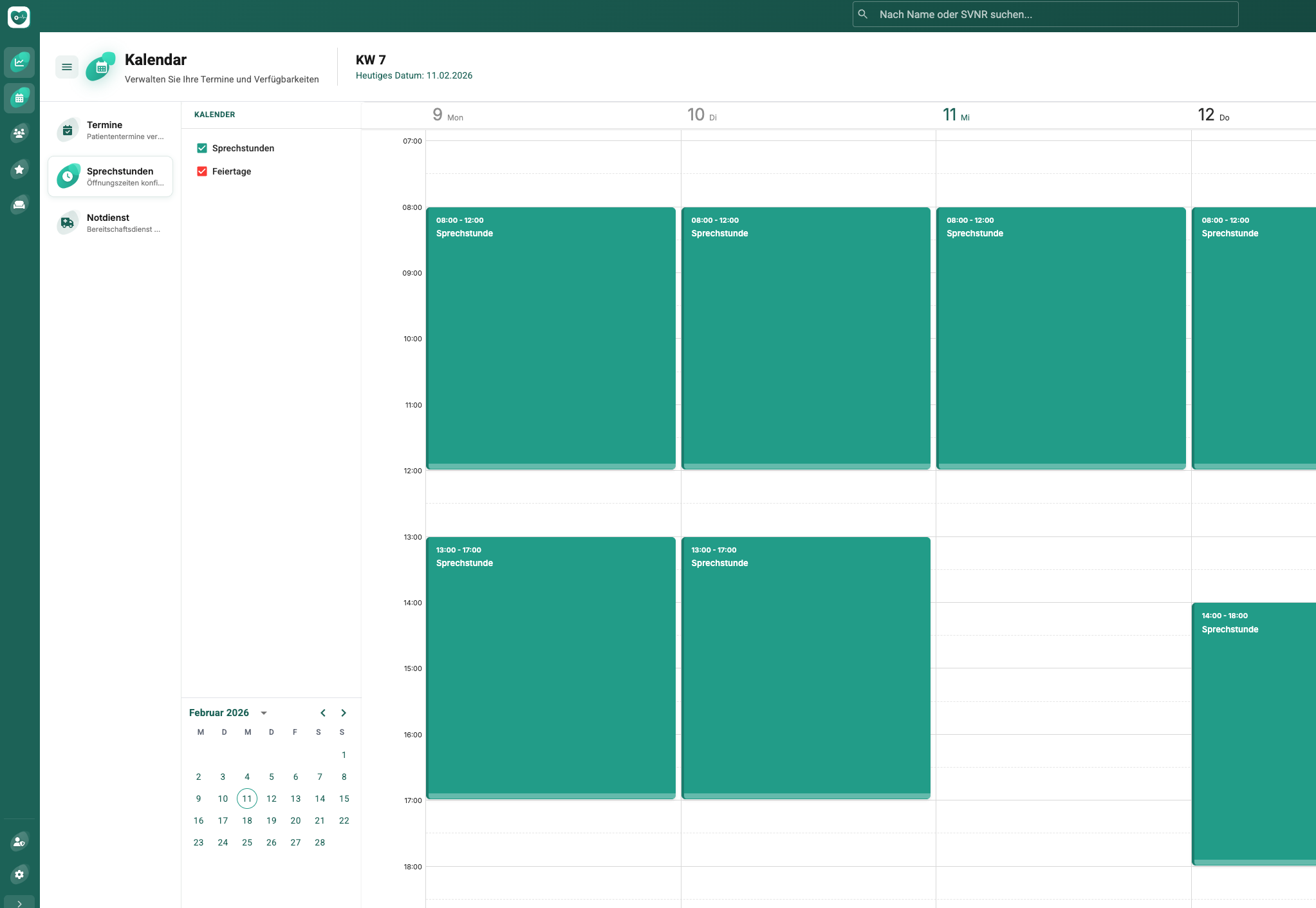 Professionelle Terminplanung mit Kalenderansichten, Sprechstundenkalender, Notdienst- & Bereitschaftsplanung und Online-Buchungsregeln – für maximale Effizienz in Ihrer Praxis.